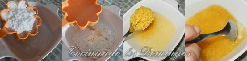 Mezclamos el azúcar pulverizada (impalpable), el jugo de limón y la ralladura hasta que se disuelva totalmente el azúcar.