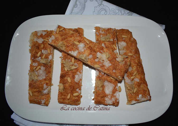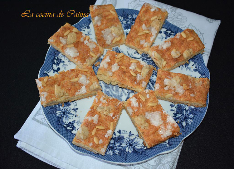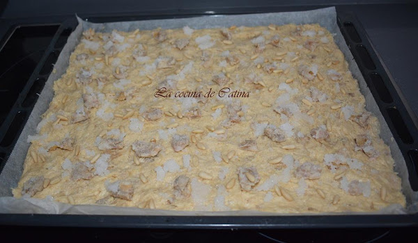 Extendemos la masa sobre una placa de horno cubierta con papel sulfurizado procurando que quede la masa lo más fina posible. Colocamos encima de forma regular los chicharrones reservados, espolvoreamos con el azúcar humedecida con agua y repartimos los piñones por encima de la torta.