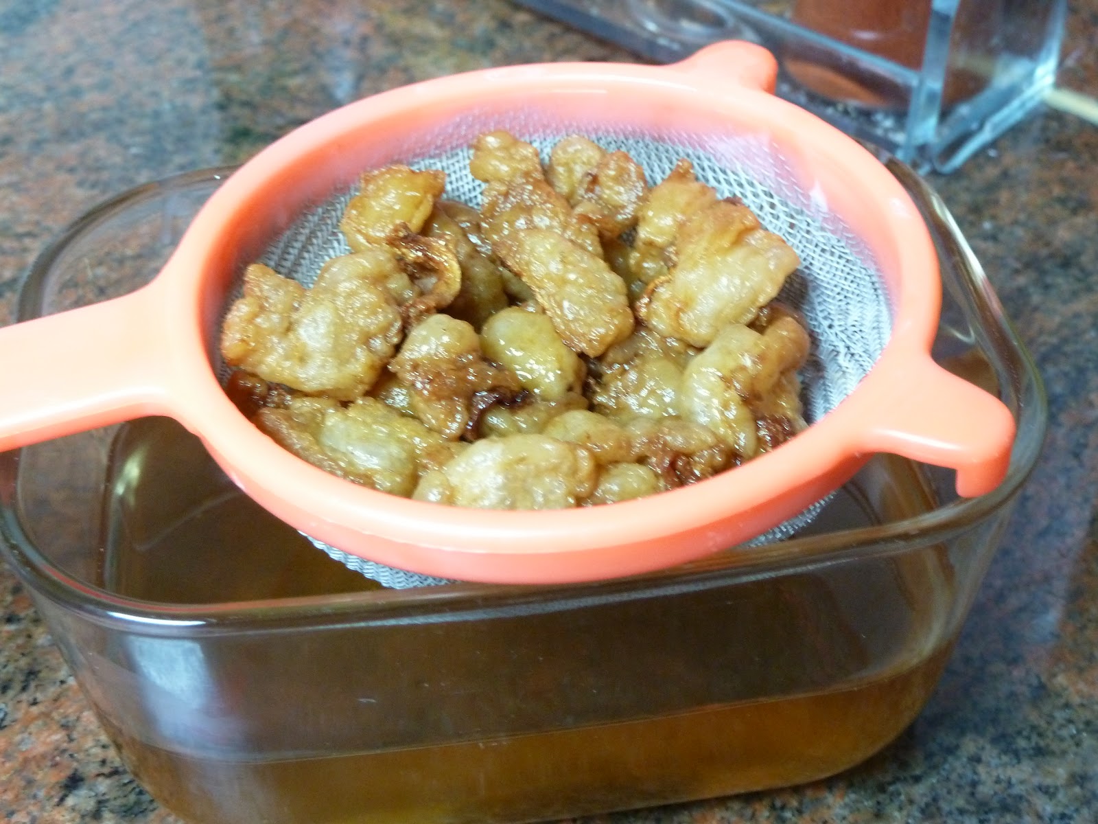 Cuando ya están dorados, se sacan de la sartén y se ponen a escurrir en un colador