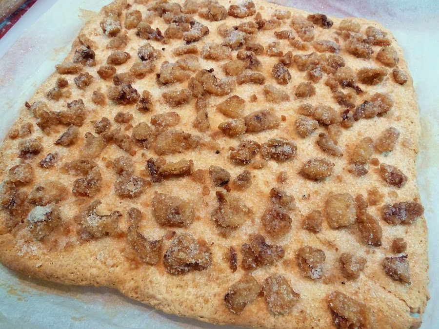 8) Rebozar los chicharrones en azúcar y repartirlos por toda la superficie de la masa, aplastándolos un poco contra la masa para que queden algo hundidos y adheridos a ella.