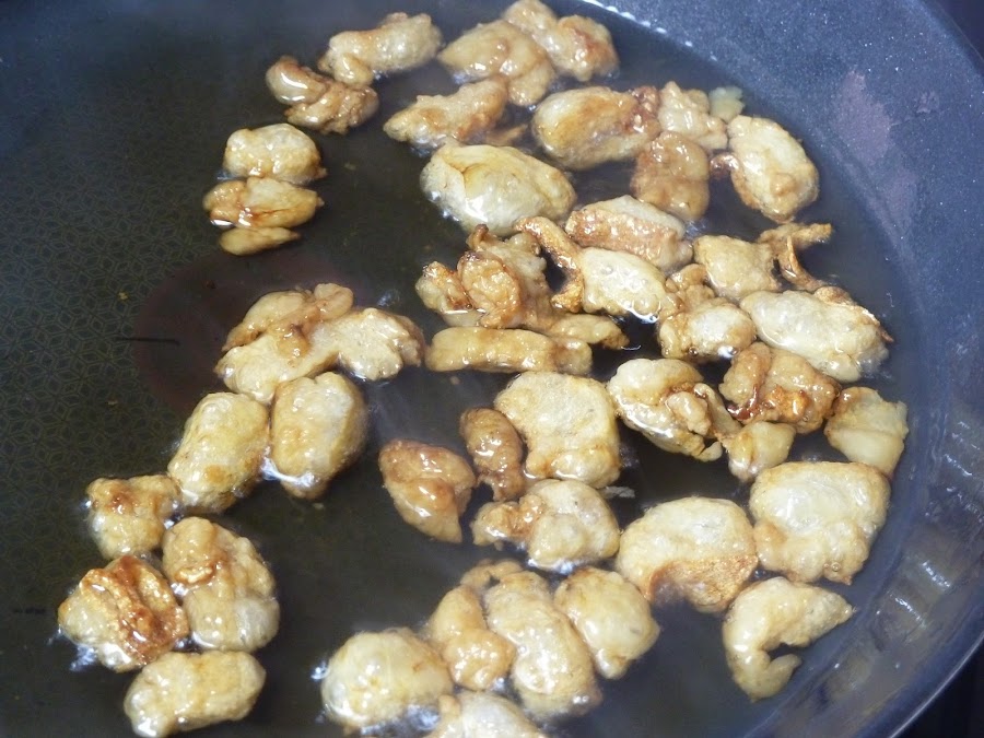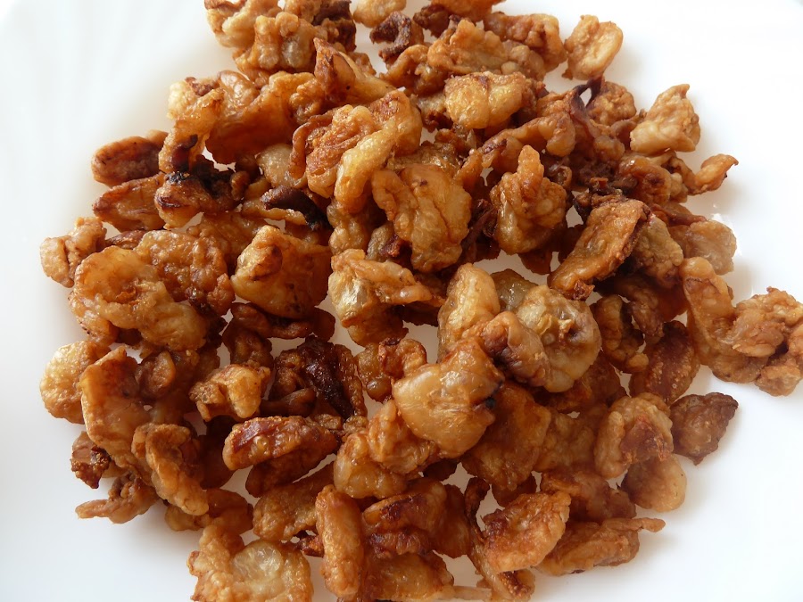 1) Hacer los chicharrones: para ello se corta la manteca en rama en trozos pequeños y se van friendo en la sartén, a fuego suave, hasta que se van consumiendo y formando los chicharrones, bien dorados (no hace falta nada de aceite, ya que enseguida comienzan a soltar grasa). Os dejo fotos del paso a paso: