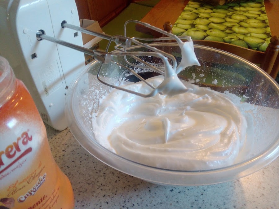En otro cuenco batir las claras de huevo hasta que queden espumosas y sin dejar de batir, añadir el azúcar de cucharada en cucharada, hasta que se formen picos.