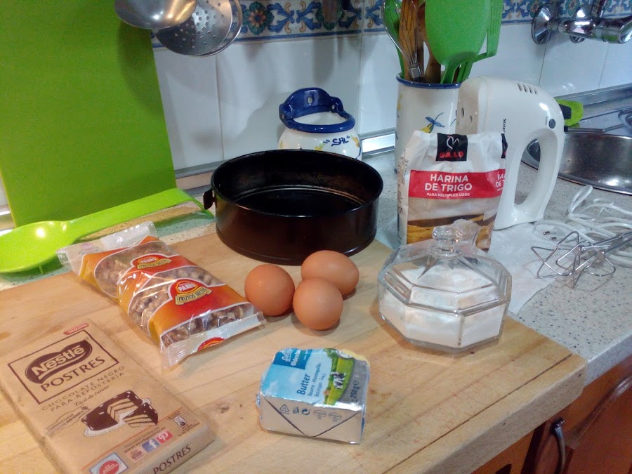 140 grms. de chocolate negro (especial para postres), 85 grms. de mantequilla, 3 huevos grandes, 28 grms. de harina, un sobre de levadura (especial para bizcochos), 55 grms. de azúcar blanquilla (azúcar glas), 100 grms. de nueces.