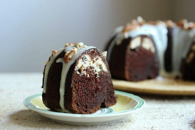 Es una torta bundt de chocolate que tiene un túnel de queso y nuez. Es decir, un toque de cheesecake adentro de la masa de chocolate. Torta de chocolate rellena.