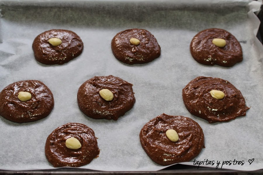Cogemos una cucharada de la masa que es muy densa, y la colocamos sobre una bandeja forrada con papel vegetal. Damos forma redonda y colocamos una almendra en el medio (podemos poner pepitas de chocolate si nos gusta más).