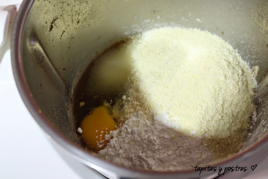Agregamos el huevo, el azúcar, la harina y la almendra molida y mezclamos todo muy bien 30 segundos a velocidad 4.