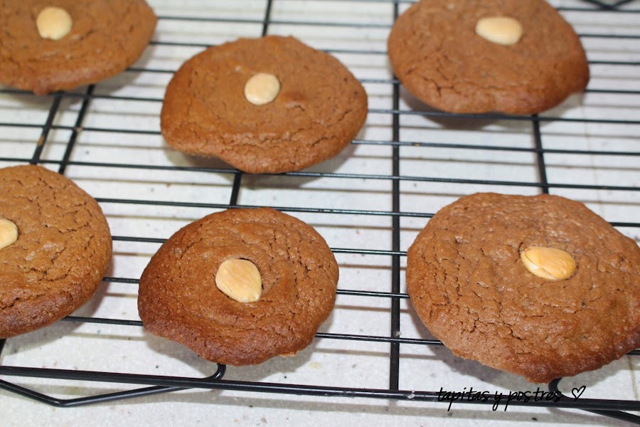 Vamos colocando cucharadas gruesas (no las hagáis muy finas) en una bandeja y le ponemos una almendra cruda encima. Horneamos unos 15 minutos. Vigilando que no se quemen, deben quedar blandas pero firmes y con el color menos intenso.
