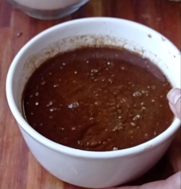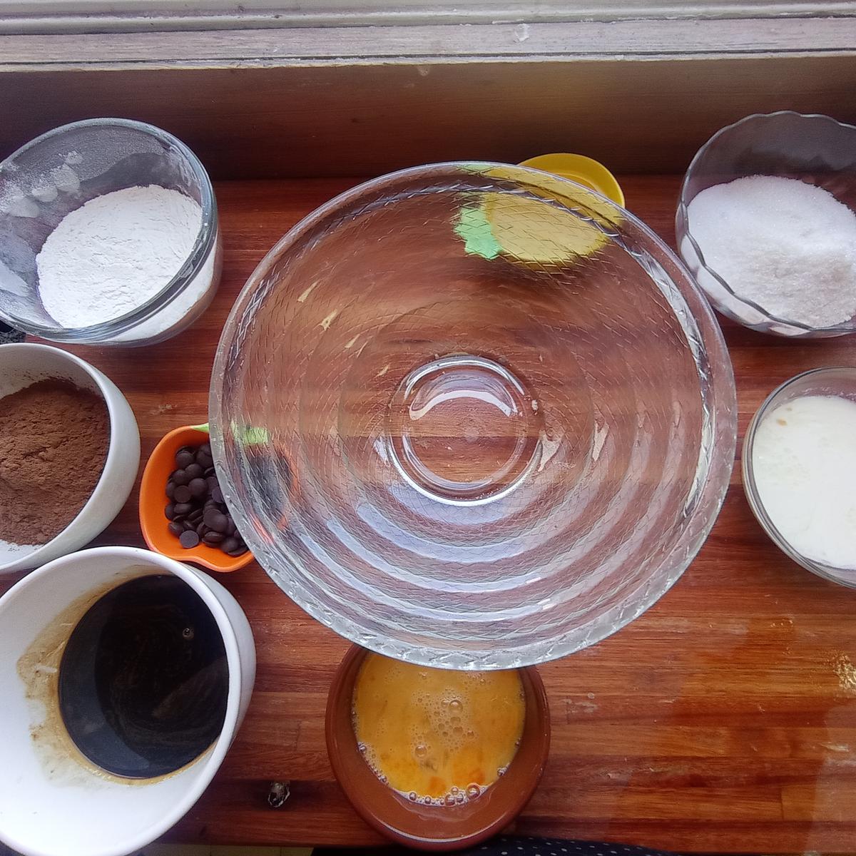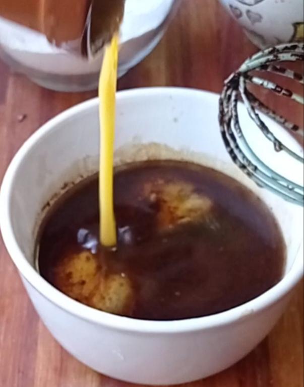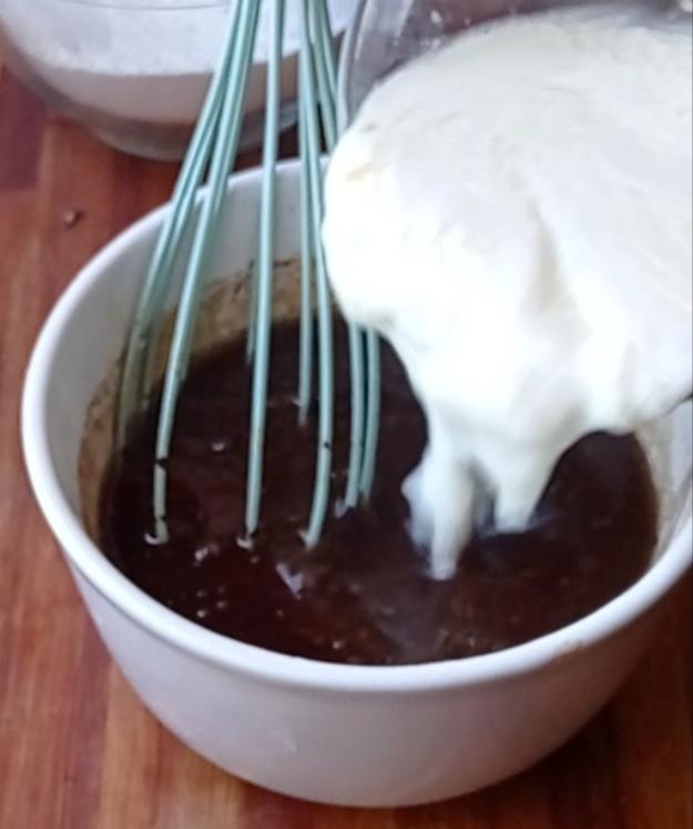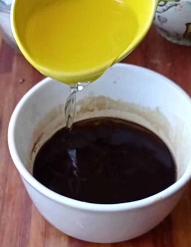 Poner en un bol el chocolate y agregar el café caliente, dejar reposar , mezclar y luego añadir el aceite, el huevo y la clara, la leche ácida y la vainilla.