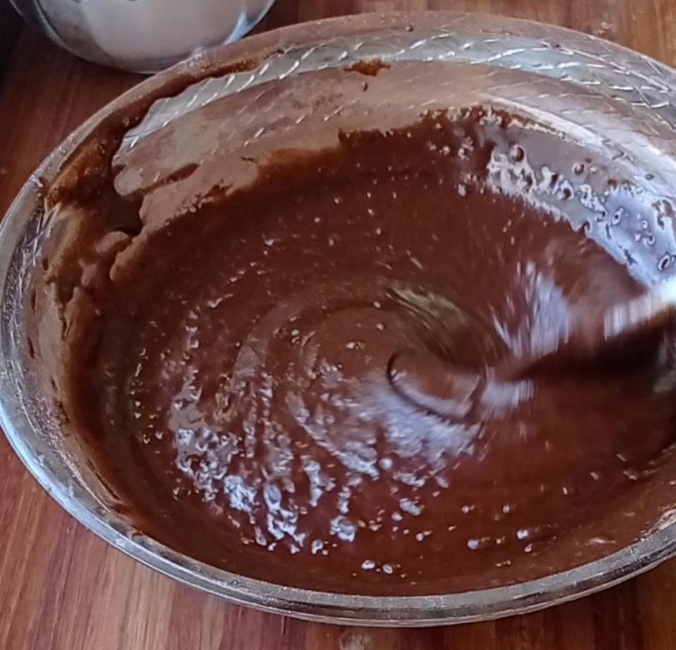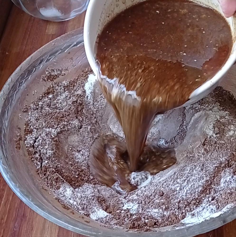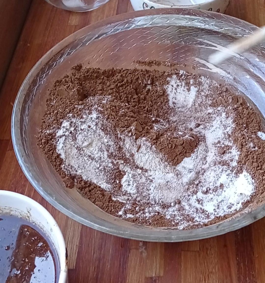 En otro bol poner los secos, azúcar, harina, cacao, polvo leudante, bicarbonato. todo bien tamizado, incorporar el chocolate y mezclar.