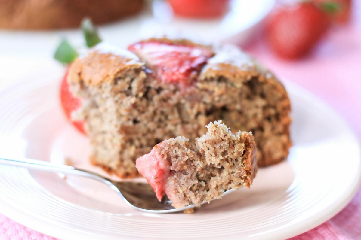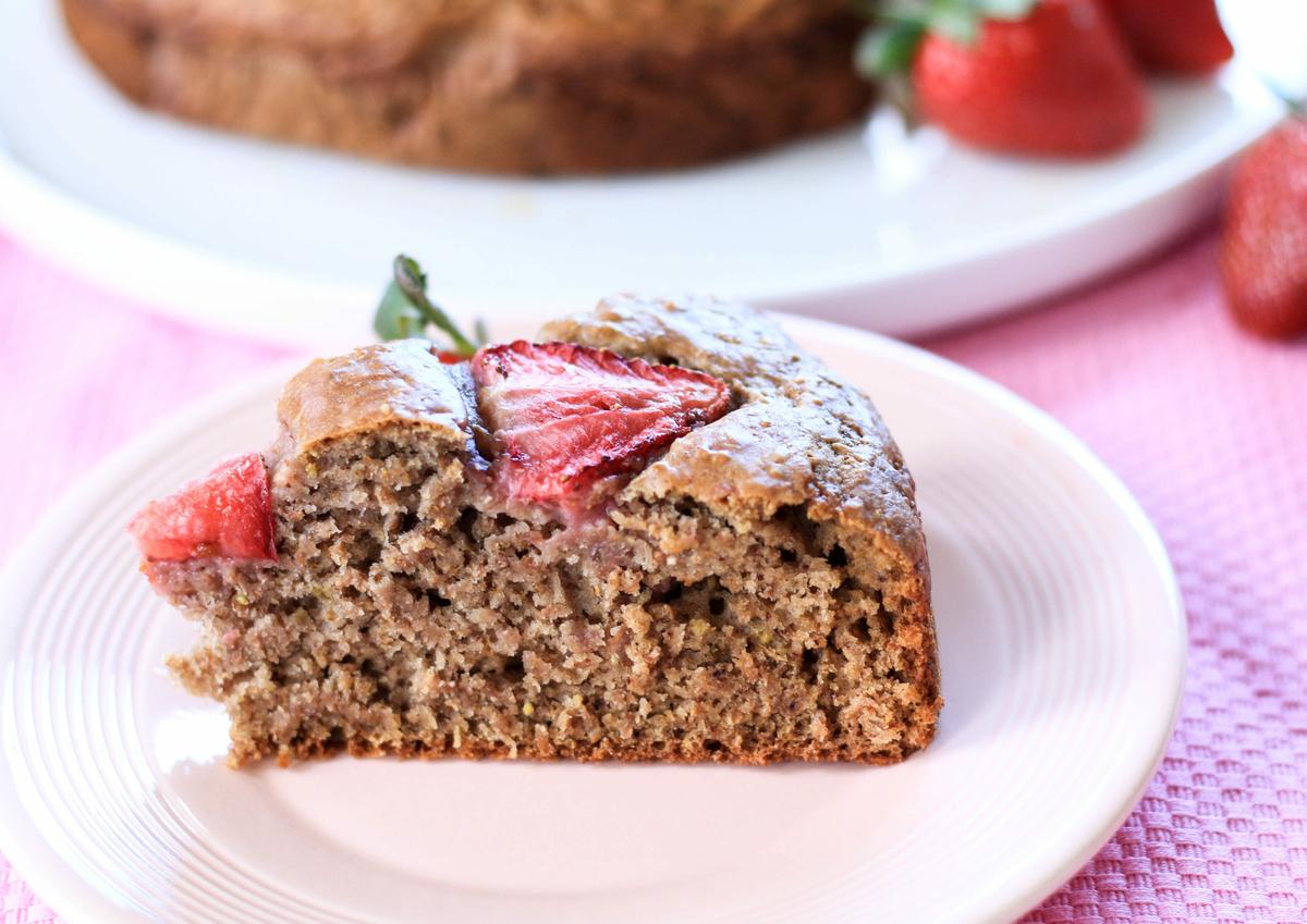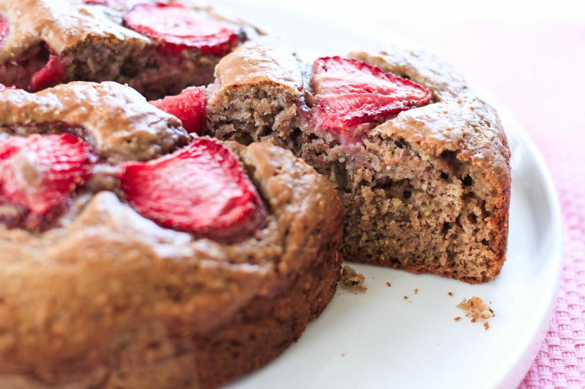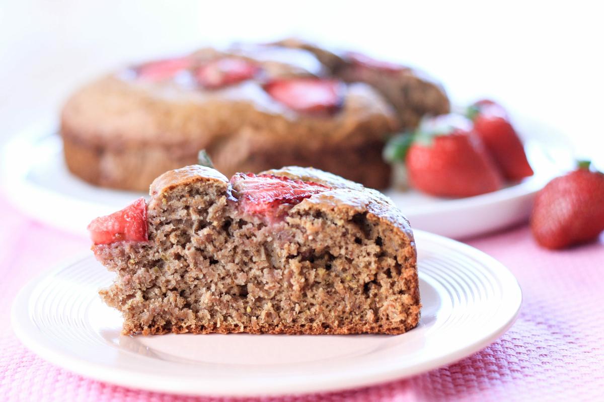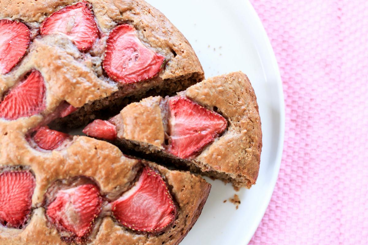 Torta de frutillas hecha con harina integral y endulzada con stevia y el azúcar natural de las frutas. Ideal para aprovechar las frutas maduras que tenemos en casa.