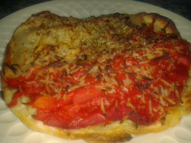 5- Cuando haya acabado el hojaldre, sacarlo y dejarlo enfriar, luego ponerle la lata de atún desmenuzada y bien escurrida, encima pimiento rojo y cebolla,cubrir con queso rallado y orégano y si te gusta puedes ponerle olivas.
