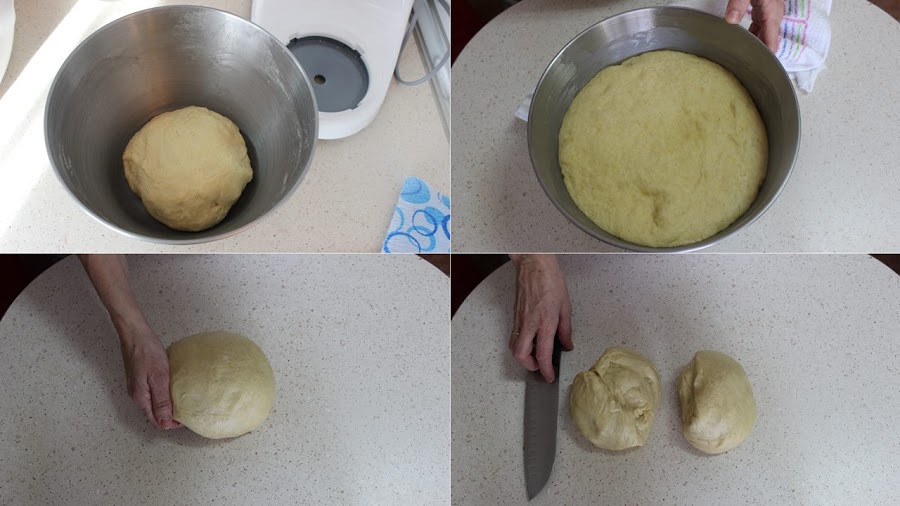 Una vez que ha levado , la sacamos y amasamos un poquito con las manos para desgasificarla. La partimos en dos trozos iguales.