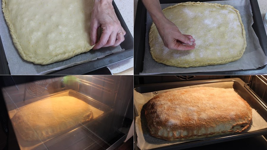Espolvoreamos la superficie con bastante azúcar y la dejamos levar en el horno apagado unos 15-20 minutos.