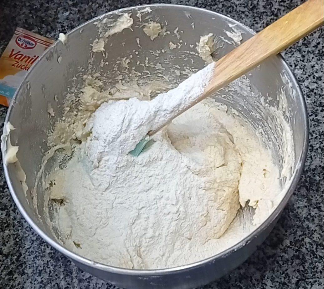 Intercalando con la crema ácida incorporamos la harina mezclada con el polvo de hornear y la sal.