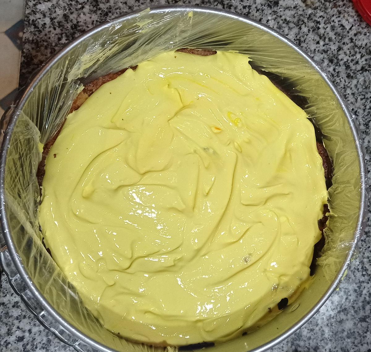 Cuando el bizcochuelo salga del horno y este frio cortarlo en tres capas y en la fuente que va a quedar la torta poner el aro del molde envuelto con film, y comenzar a hacer la crema de limón que la ponemos caliente
