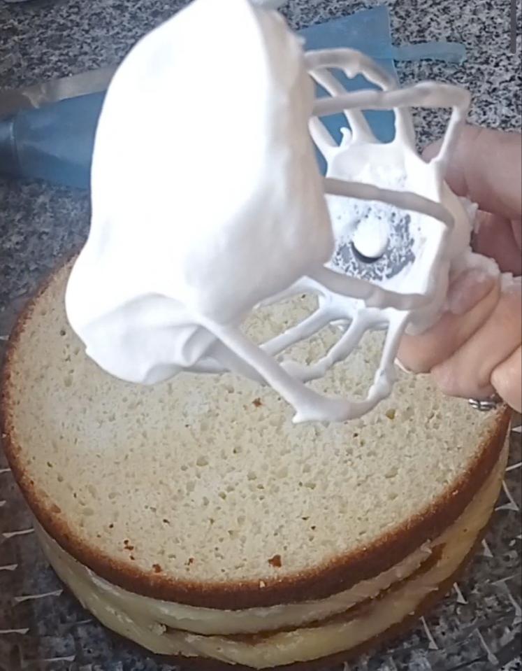 Cubrir la torta de forma que queden picos y con un soplete dorar, si no tenés soplete podes poner en la parrilla del horno para que el de el calor de arriba pero solo unos segundos o se derrite la crema de limón, otra opción es espolvorear con cacao.