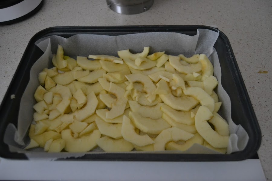 Pelamos y cortamos las manzanas en laminas no muy finas y cubrimos la base.