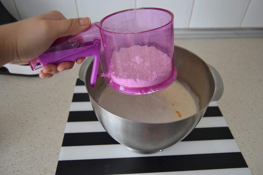 Una vez que tenemos listo ese paso, le vamos a agregar la harina, tamizándola, e integrandola con movimientos suaves, para no bajar la espuma de los huevos.