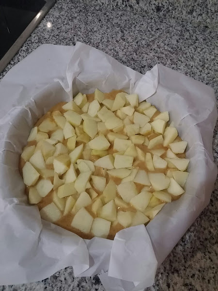Cortar las manzana en trozos y distribuirla por encima hasta cubrirlo entero.