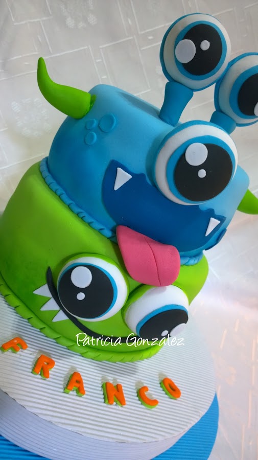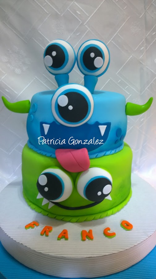 Torta Monster hecha con masa para modelar, bizcochuelo de vainilla, rellena de dulce de leche y crema de mani.....