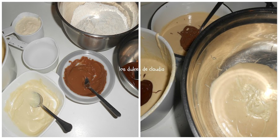 He adaptado una de mis recetas dividiendo la masa en tres partes iguales y como lleva chocolate negro .éste también lo he dividido en tres para poner el choco blanco, negro y con leche.