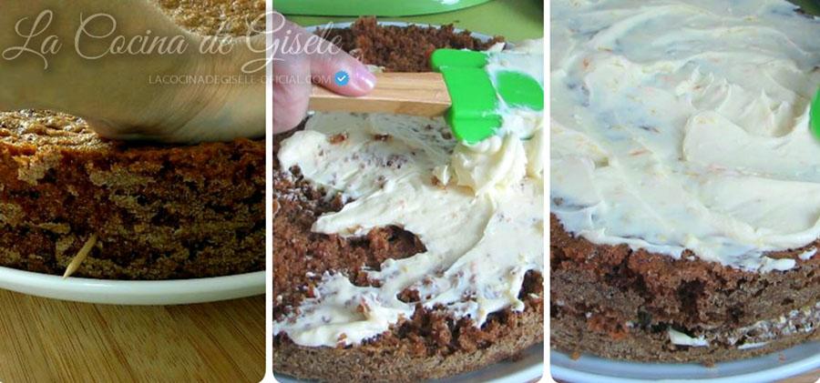 Rellenamos la mitad del bizcocho con el frosting, cubrimos con la otra mitad, volvemos a decorar con más frosting en el tope y por último decoramos con un puñado de nueces.