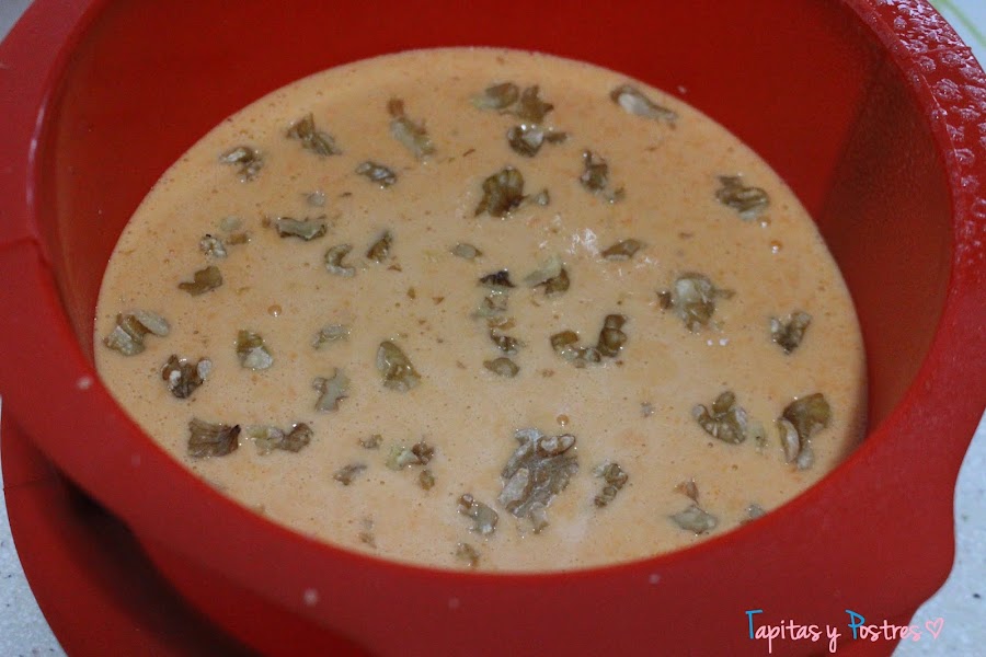 Vertemos la mezcla en un molde engrasado. Mi molde es de 18 cm. Echamos las nueces troceadas por encima. Horneamos 40 minutos a 180º, con calor arriba y abajo.