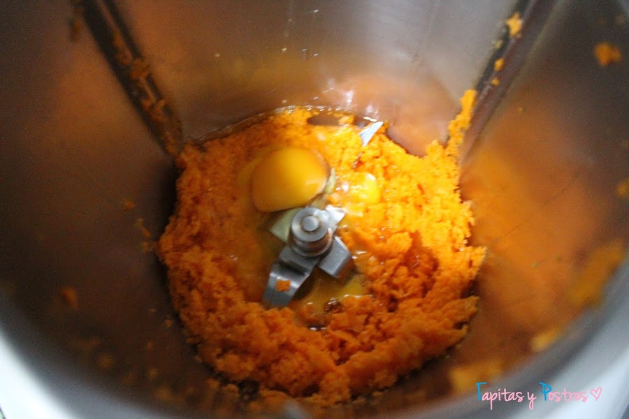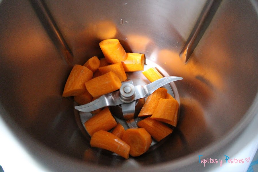Ponemos las zanahorias peladas y en trozos en el vaso de la thermomix y trituramos 5 segundos a velocidad 6 y media. Podemos hacer esto con una picadora o batidora normal.