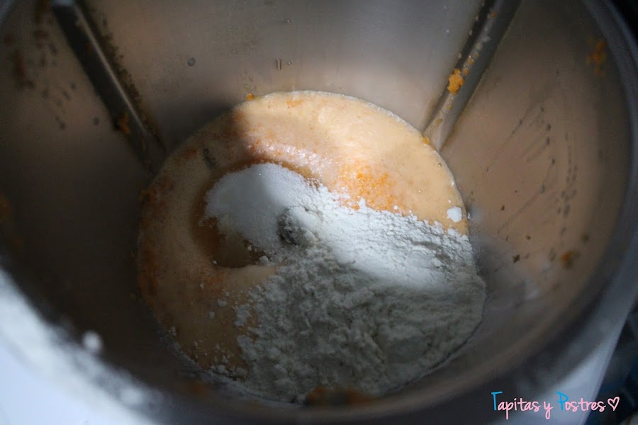 Añadimos el aceite, la leche, el azúcar, la harina y la levadura. Batimos 30 segundos a velocidad 3.