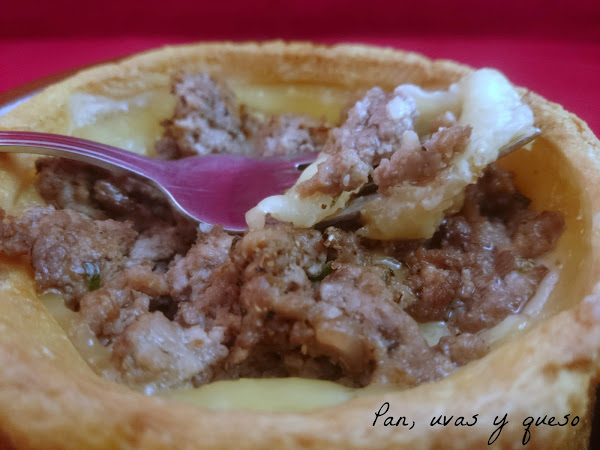 Y para sacarle todo el provecho a este queso de intenso sabor, se me ocurrió rellenarlo (después de comer el queso y que quedase casi vacío) y hornearlo. De esta manera, el queso pegado a la corteza se fundirá y podremos comerlo mezclado con el relleno.