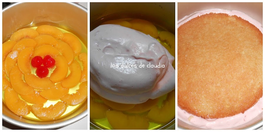 En el molde de 22 centímetros, poner un poco de gelatina de piña y refrigerar, cuando la gelatina esté a medio cuajar acomodar los melocotones y agregar un poco más de gelatina hasta que cubra, refrigerar hasta que cuaje.