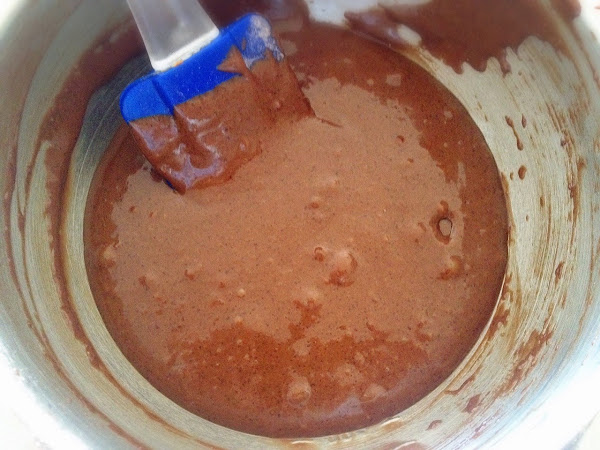 4. Agregar el agua caliente en forma de hilo sin dejar de batir hasta tener una mezcla homogénea y algo líquida.