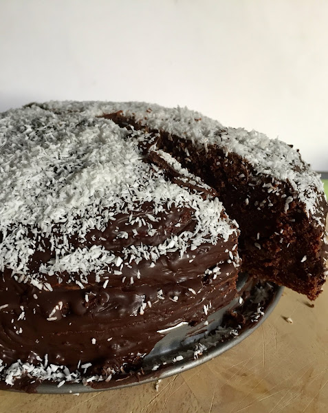 Saque la torta de la nevera, la pique a la mitad con cuidado, la rellene de ganache, y en el micro puse el chocolate de la cobertura en trozos con una cda de aceite de coco por un par de minutos, y cubrí la torta y le eche por encima el coco rallado, deje la torta a temperatura ambiente por una hora y listo, acompañada de un buen café o sola, deliciosa y ha disfrutarla.
