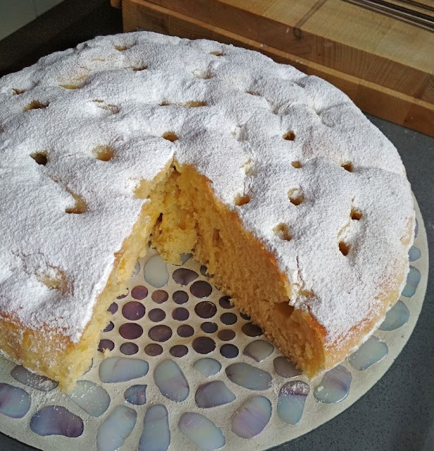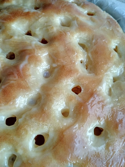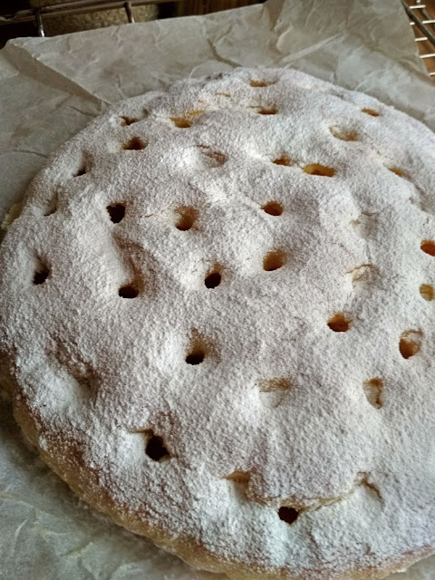 Calor arriba y abajo durante unos 12-15 minutos o hasta que la torta empiece a dorarse. La dejamos reposar sobre una rejilla y tratamos de "reabrir" aquellos agujeros que se hubieran cerrado durante el horneado.