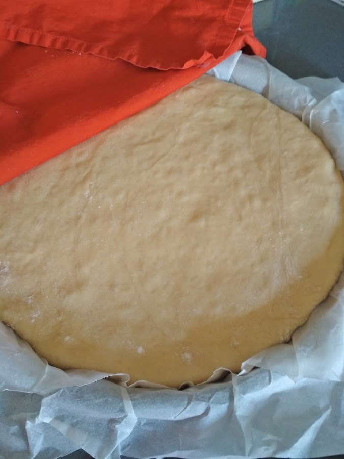 Ayudándote de un molde forrado de papel de hornear, extendemos la masa dándole un grosor igualado.