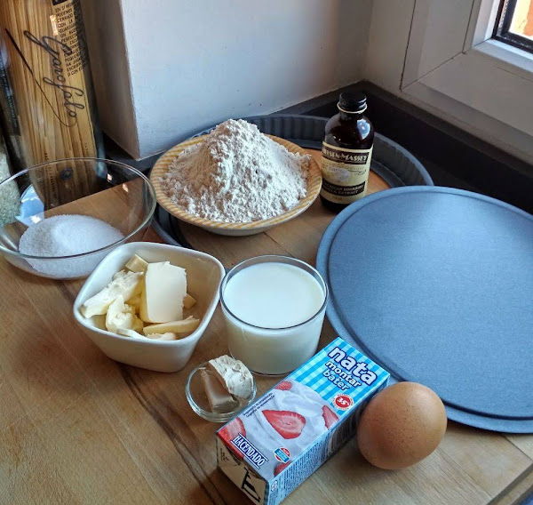 Mientras, podemos ir haciendo la crema de nata (crema de leche). En una cazuela, ponemos la nata (crema de leche), el azúcar y un poco de esencia de vainilla.