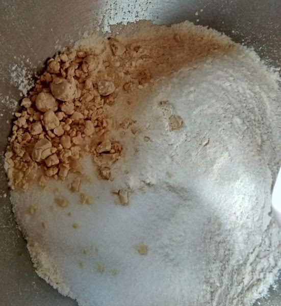 En el vaso de la amasadora o en un bol grande, ponemos los ingredientes secos. Harina, azúcar y levadura. Mezclamos bien.