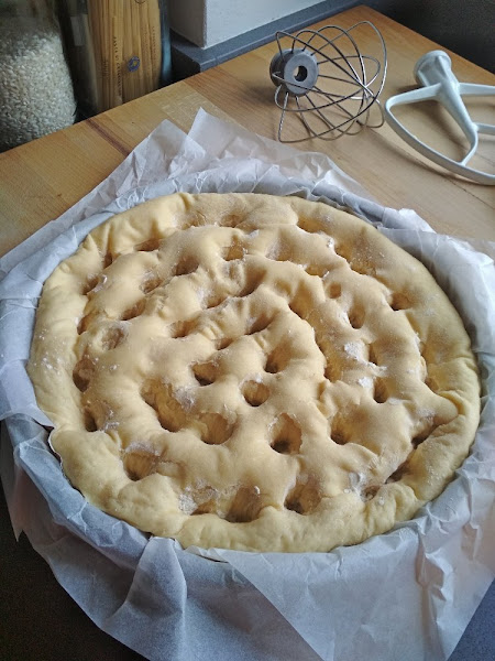 Horno a 180º. Le hacemos agujeros a la masa, con los dedos, antes de introducirla en el horno ya caliente.