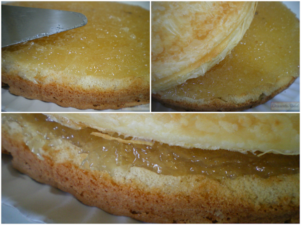 Cortamos con el mismo molde del bizcocho el hojaldre para tener un círculo del mismo tamaño. Horneamos a 200ºC,colocando el mismo molde encima del hojaldre para que no suba.