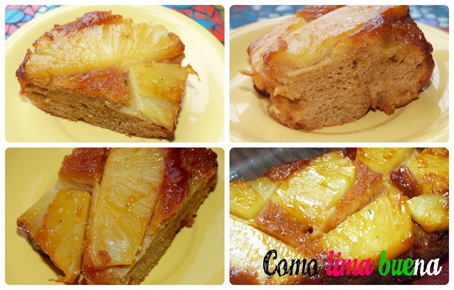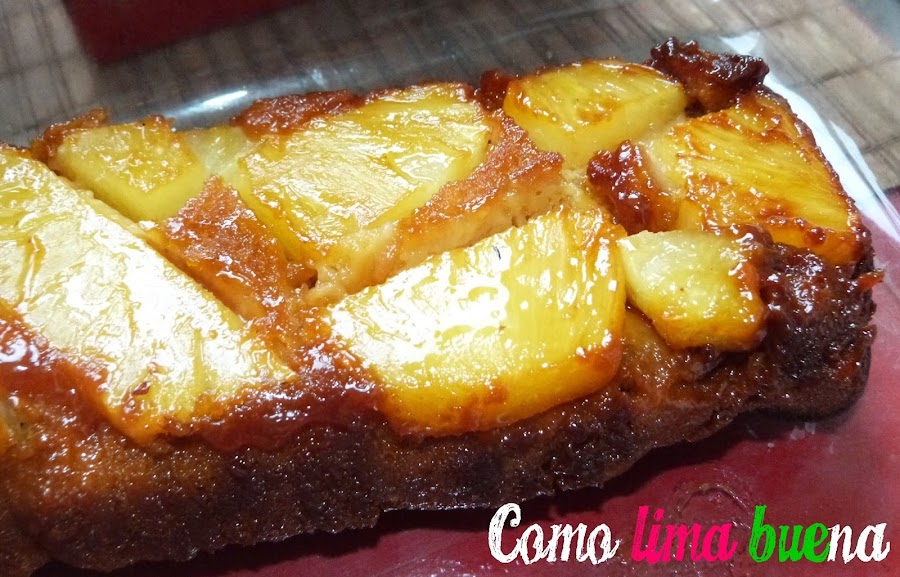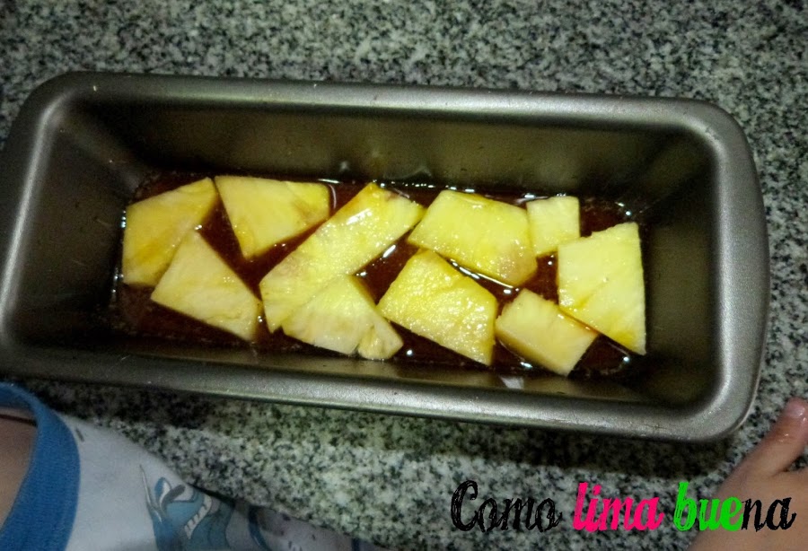 Empezamos derritiendo en microondas o a fuego bajo la manteca con 1/2 taza de azúcar (en este caso usamos azúcar integral mascabo). Colocamos esa mezcla en el fondo de la budinera o tortera y cubrimos con el ananá (piña) cortado según corresponda.