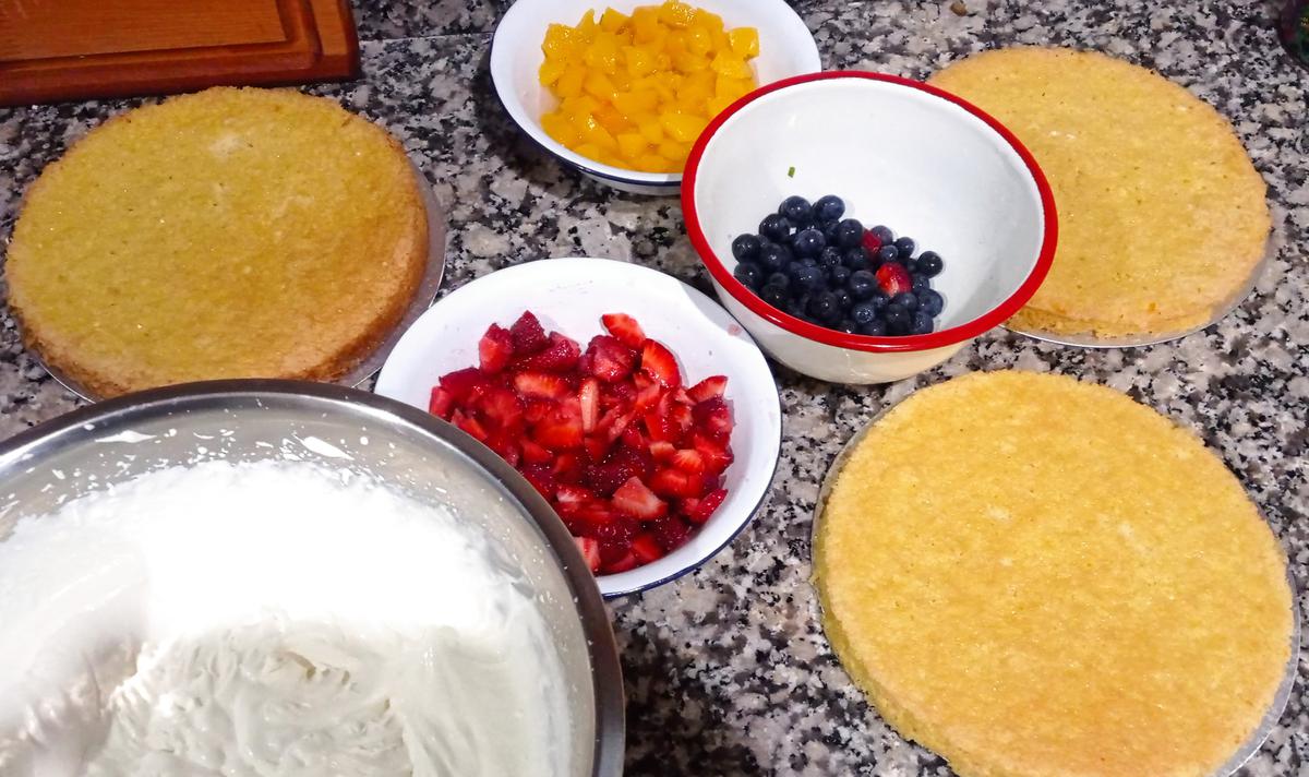 Rellenar la capa de abajo con crema y frutillas picadas, la segunda con crema y duraznos picados y luego cubrir la torta con la crema restante y decorar con las frutas y algunas mandarinas confitadas.