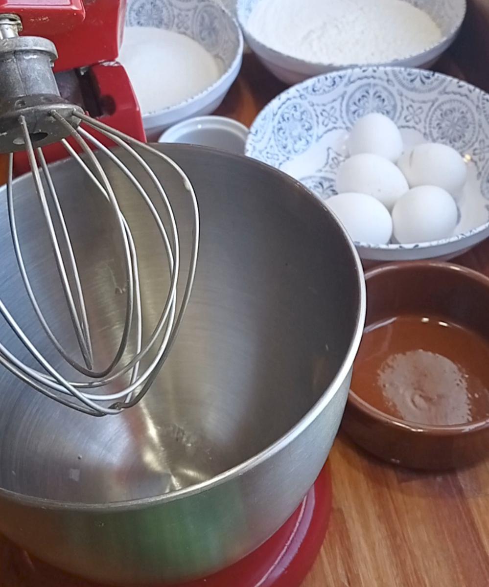 Batiendo por separado claras y yemas. En ese caso el agua hirviendo se agrega al batido de las yemas y luego se unen con las claras, y se procede a añadir harina en forma de lluvia como movimientos envolventes para no bajar el batido.