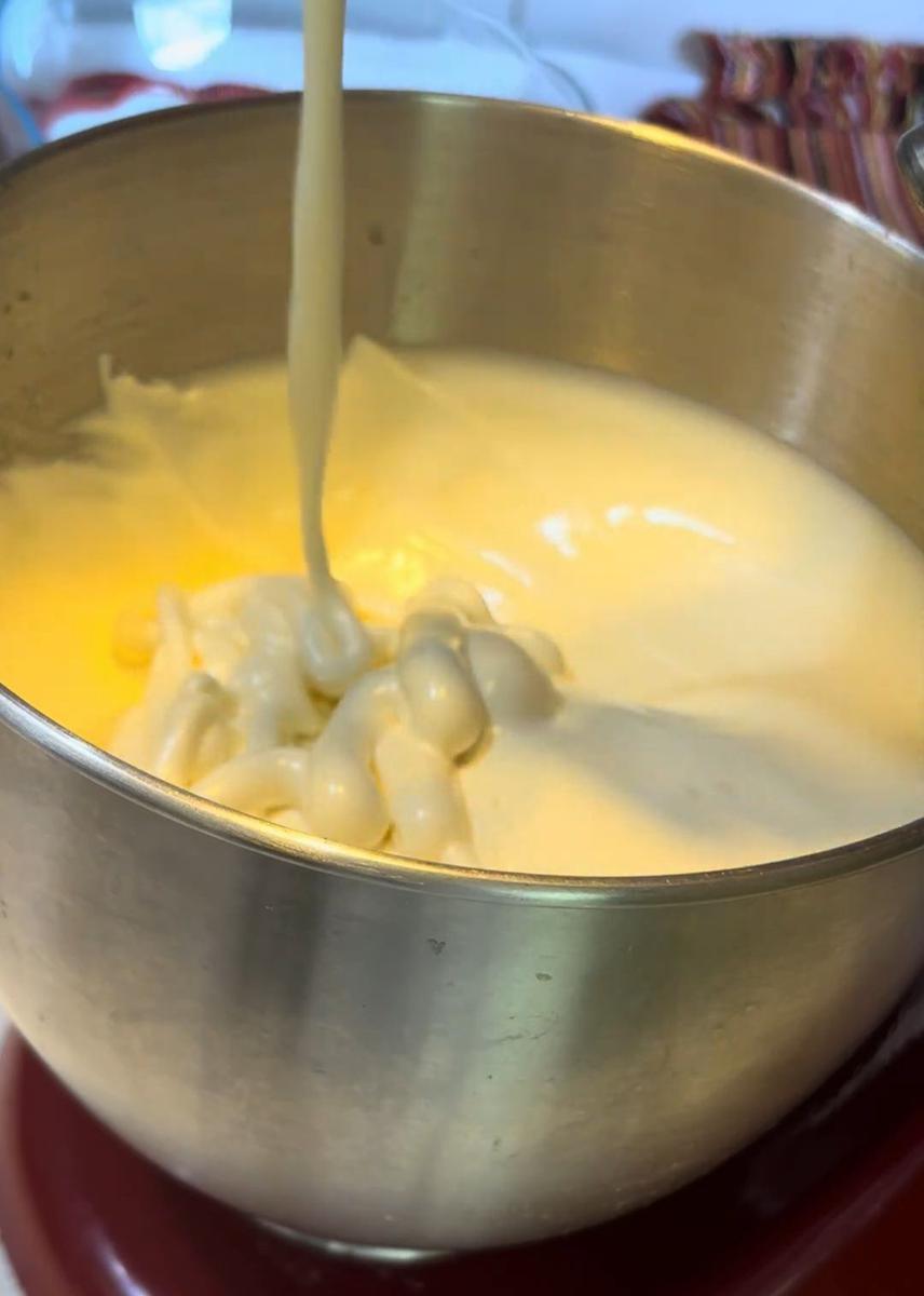 1_Mezclar las yemas, huevos , azúcar y miel y batir a baño María , hasta llegar a 45 grados o que este apenas tibia y chirla. El objetivo de hacer esto es disolver el azúcar y lograr un batido más espumoso