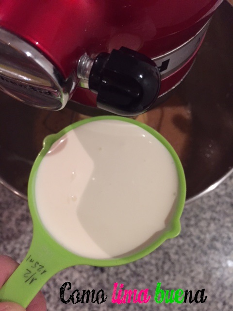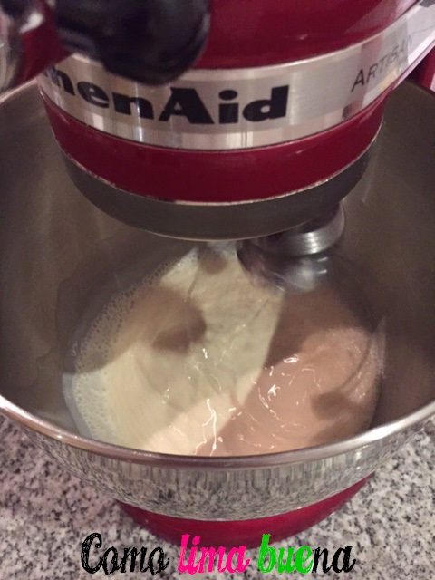 Batir la leche evaporada (previamente enfriada en la heladera por unas 6 hs aprox) hasta triplicar su volumen