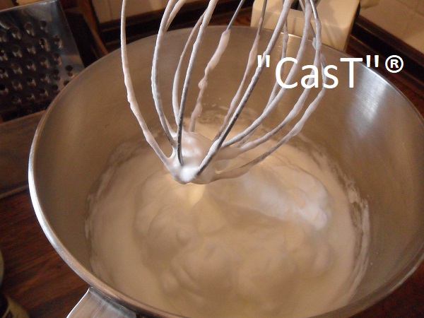 En primer lugar separamos las yemas de las claras y ponemos estas ultimas en la KitchenAid con el accesorio de barillas. Montamos a punto de nieve con una pizca de sal. Reservamos.