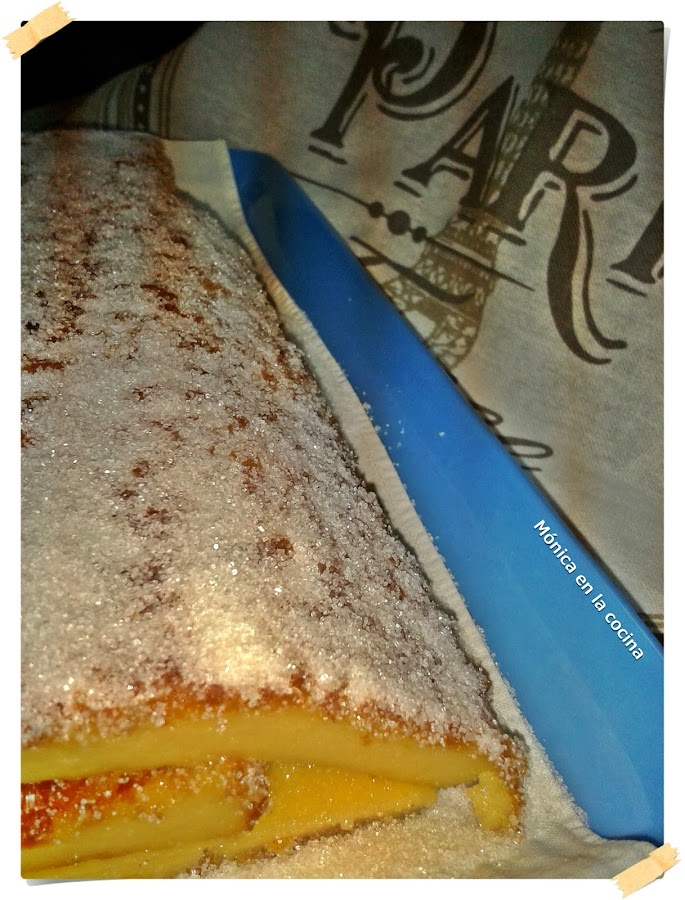 Esta torta tiene aspecto de brazo de gitano, pero está a medio camino entre el bizcocho, el puding y el flan con un delicioso sabor a naranja. Además, como apenas lleva harina, me pareció interesante para las dietas sin gluten.