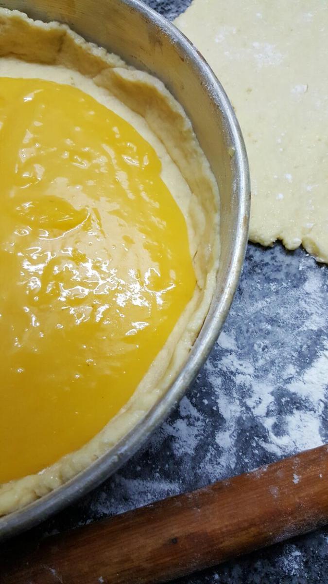 Masa: Tamizar juntos la harina y el polvo de hornear,añadir la sal y el azúcar.Agregar la manteca y desmenuzarla con un tenedor formando un arenado.En este paso también se puede usar el procesador de alimentos. Añadir el huevo, la leche y la piel rallada de limón .Amasar solo lo necesario para unir los ingredientes.