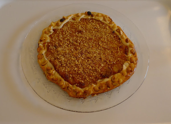 Replegar los bordes de la masa, pinchándolos con un tenedor y pincelando con la clara del huevo. Colocar decorando los frutos secos.