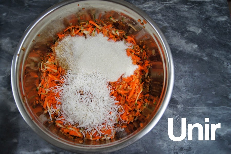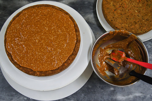 El keke (receta de Sandra Plevisani) es muy saludable gracias a todas las vitaminas y minerales que los vegetales aportan, además, no lleva lácteos y tiene muy poca grasa (a pesar de eso, el keke queda húmedo). Es muy fácil y rápido de hacer, solo se deben mezclar los ingredientes con la ayuda de una cuchara de palo, sin embargo, lo que toma tiempo es rallar los vegetales. Yo utilicé aproximadamente 1 zucchini, 3 zanahorias grandes y 5 manzanas. Rellené la torta aligerando manjar blanco con licor de naranja y mezclado con coco rallado. La cobertura es crema de mantequilla (aquí está la receta) que perfumé con ralladura de tangelo y licor de naranja.