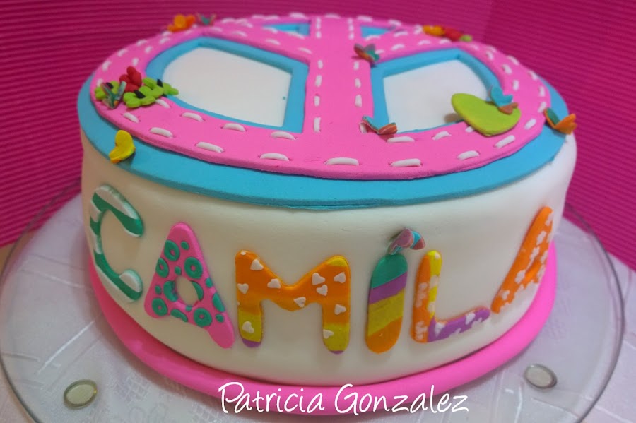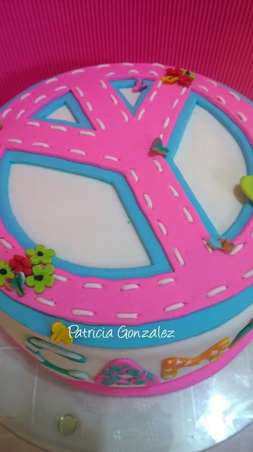 Hoy traigo una torta con el símbolo de la Paz, fue a pedido de una mamá de una compañera de escuela mi hija, me encanto mucho, los apliques y detalles están hechos de con pasta de goma, forrada con fondant, con un bizcochuelo, de chocolate rellena con crema de marroc, y dulce de leche..